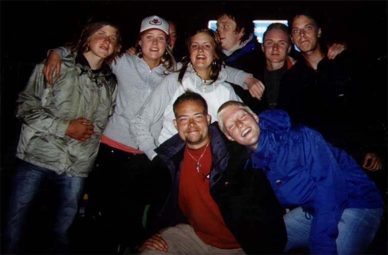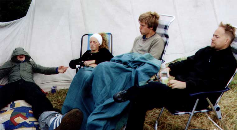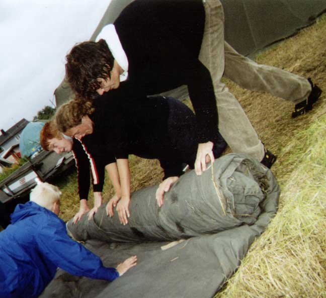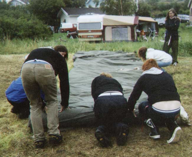 Nu rullar vi ihop vårat stora, blöta tält...