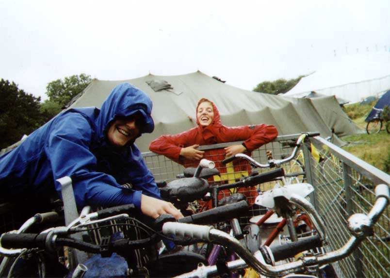 Sanna och Miriam är glada och packar cykelkärran i regnet...