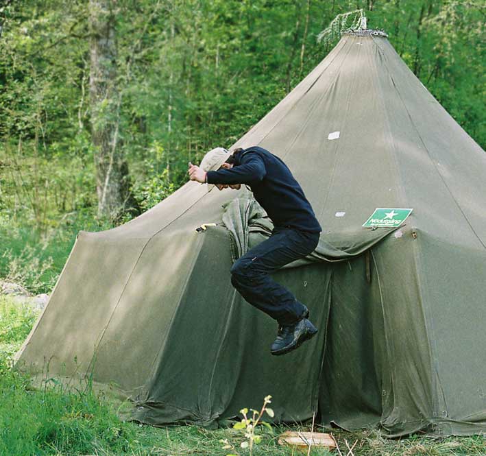 Kalle anlägger en gångbro in i tältet...
