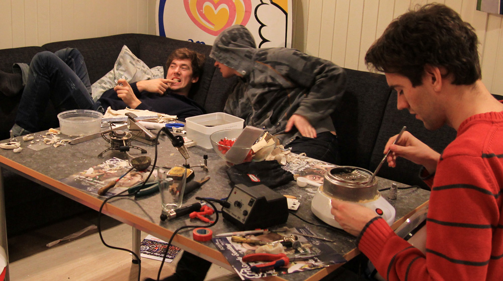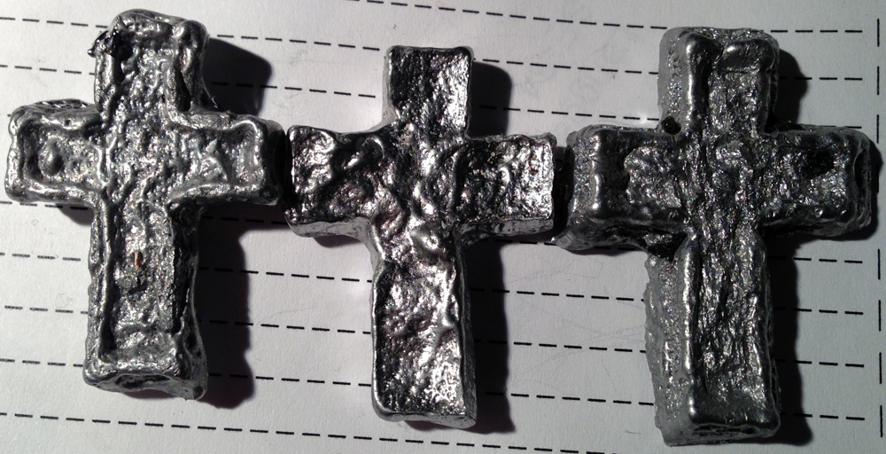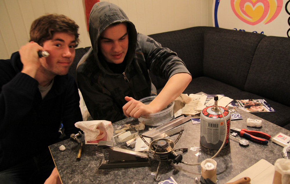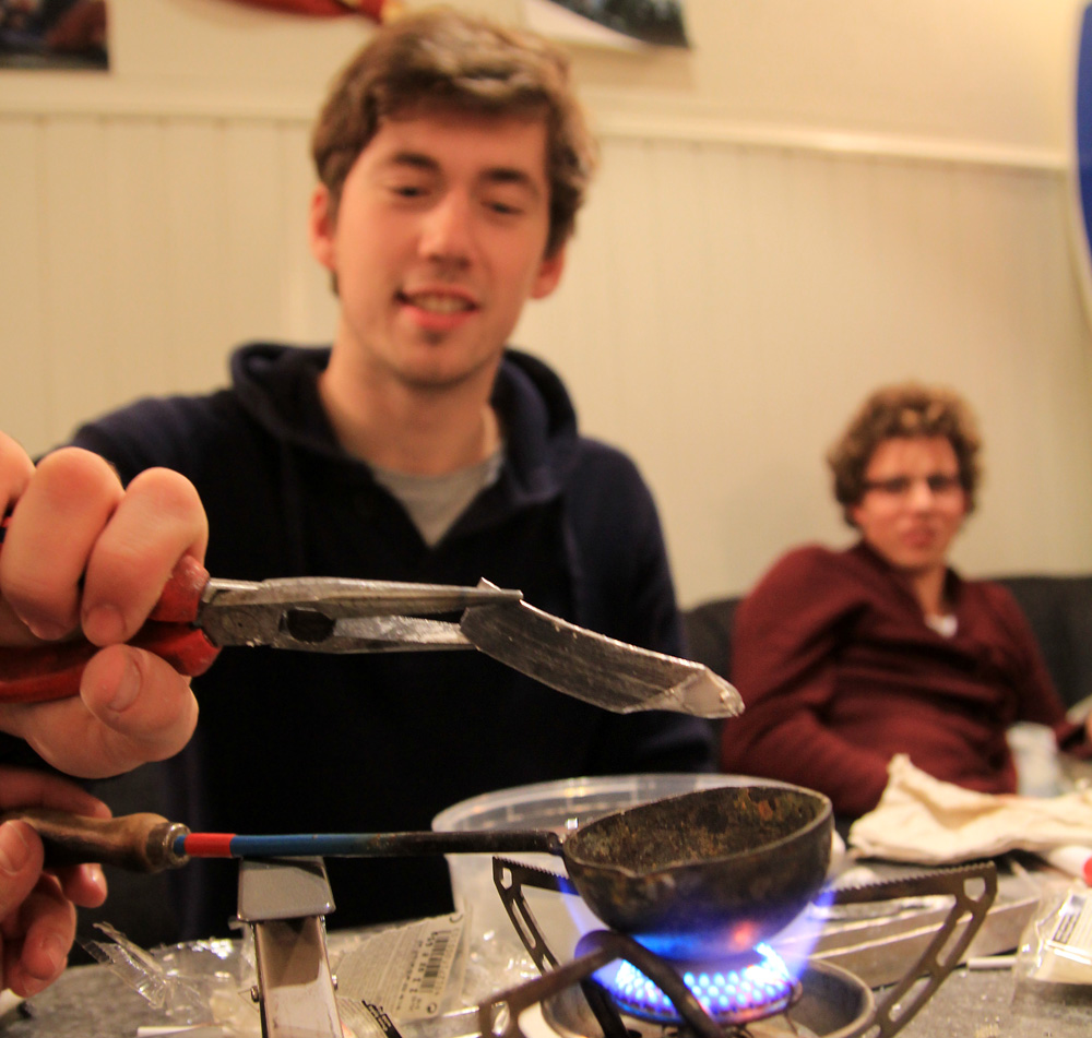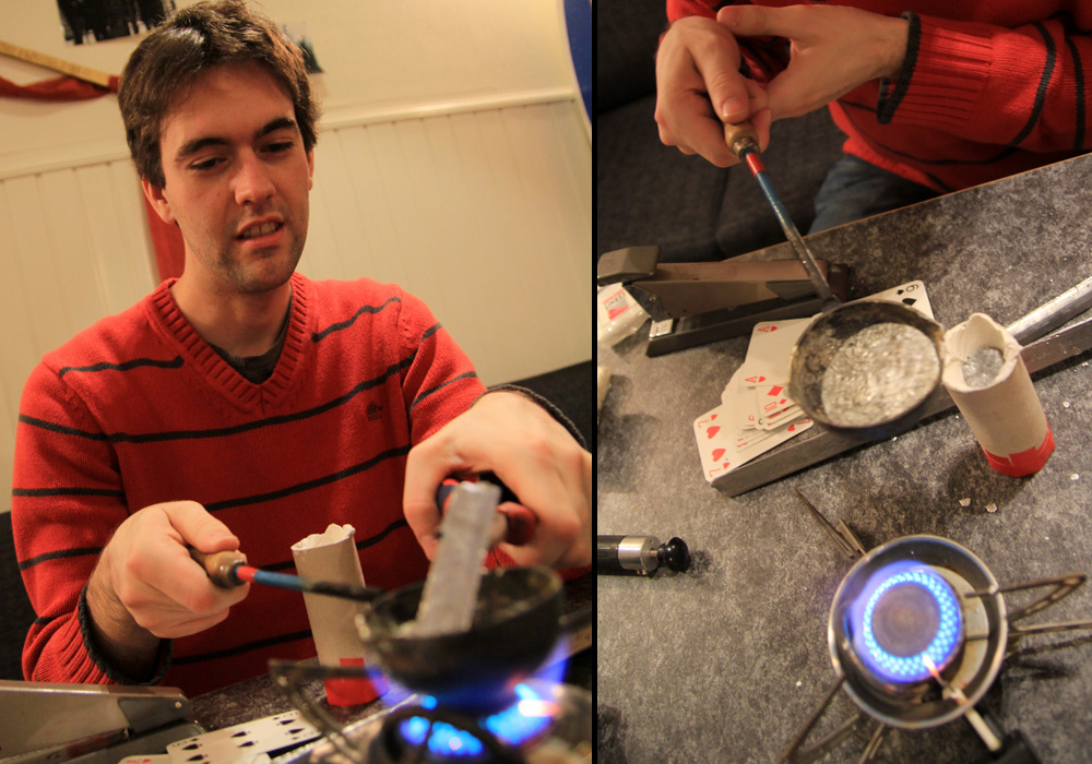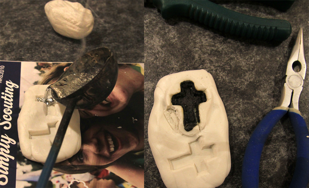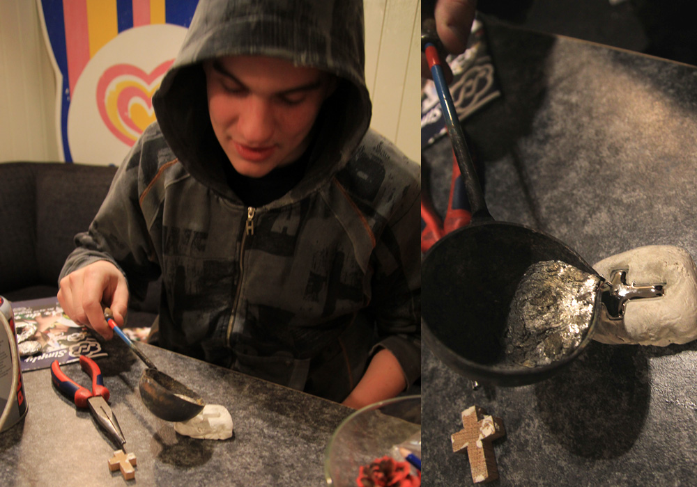 Medan Daniel gjuter ett kors i obränd cernitlera som bränndes av tennet och då luktade något så vansinnigt illa :)